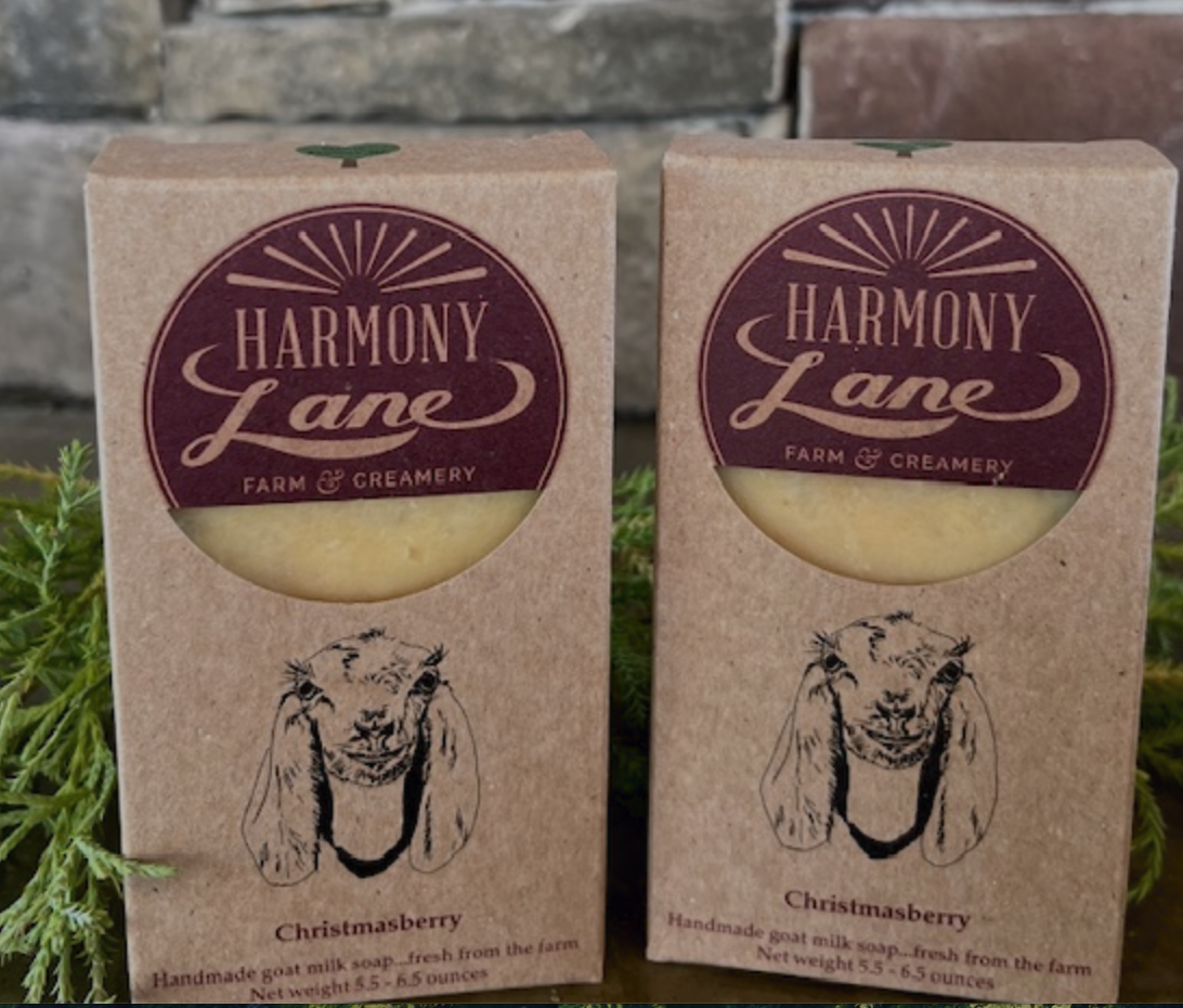 What's inside? Fresh Harmony Lane goats milk, saponified 100% organic coconut oil, organic palm oil, non GMO vegetable oil, food grade olive oil, organic avocado oil, castor oil, with fragrance oil.