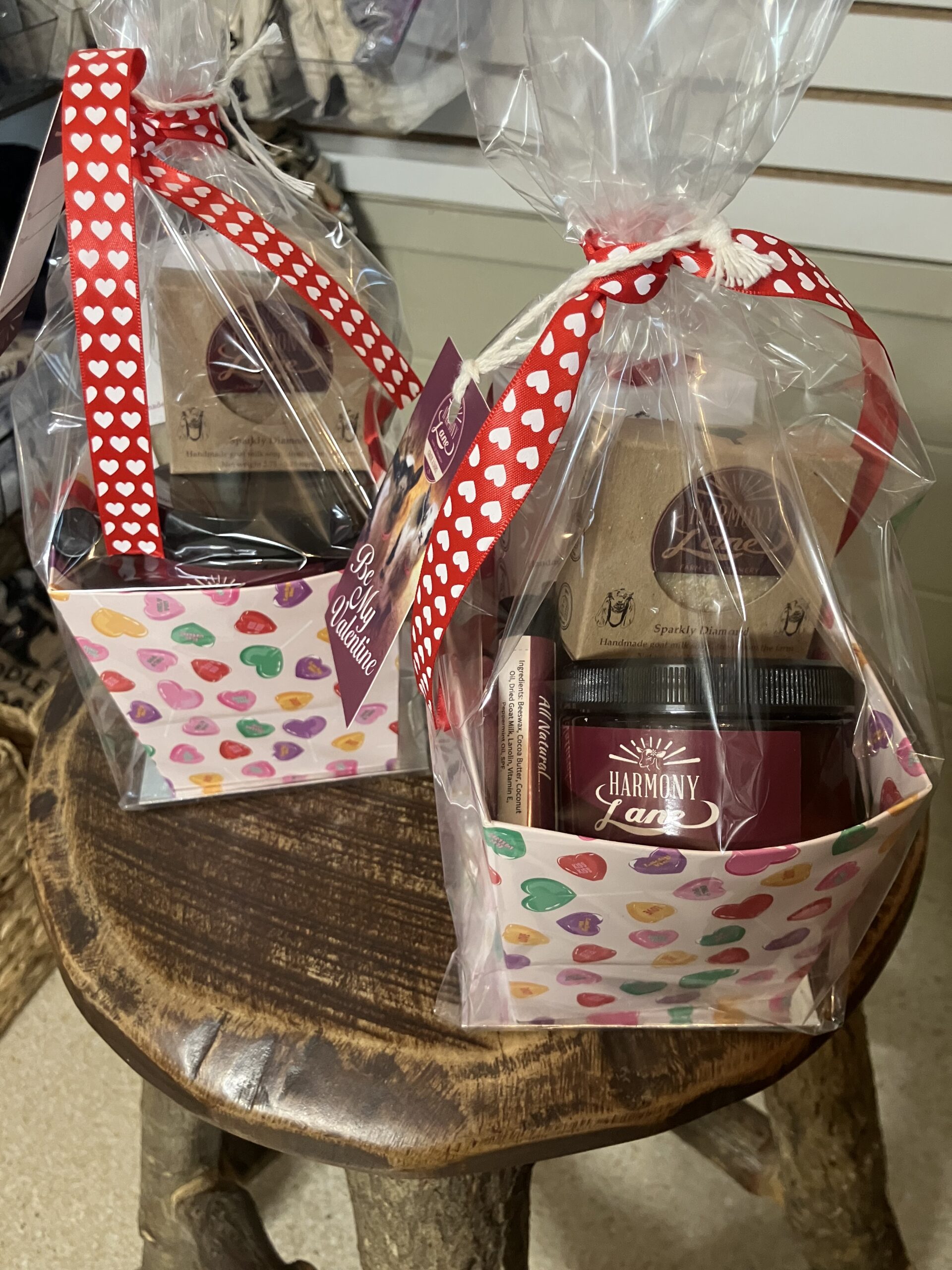 In a decorative conversation heart box, there is 1 4.9oz Lovespell lotion, 1 lip balm, 1 full size Lovespell soap bar, 1 half size Sparkly Diamond soap, and a "Be My Valentines" gift tag. Wrapped in cellophane with decorative bow.